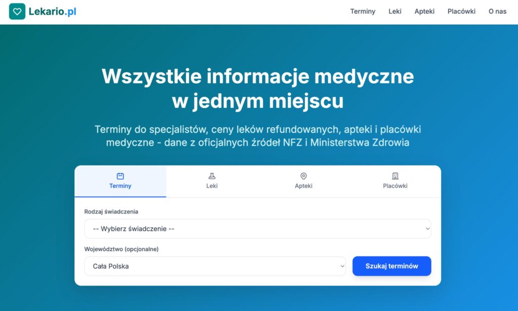 Kompleksowy portal medyczny agregujący dane z oficjalnych polskich źródeł w jednym miejscu. Wszystkie informacje medyczne w jednym miejscu – terminy do specjalistów, ceny leków refundowanych, apteki i placówki medyczne.
